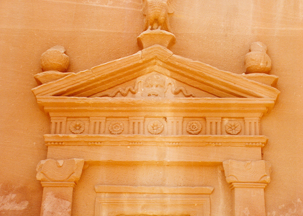 Σκαλιστή λεπτομέρεια ανακούφιση ακριβώς πάνω από την είσοδο του τάφου. Στο κέντρο, υπάρχουν ένα κουτί με δύο φίδια μάσκα, το σύμβολο της προστασίας από τα Ναβαταίοι. Λεπτομέρεια από το γλυπτό του εδάφους πάνω από την είσοδο του τάφου. Στη μέση μπορούμε να δούμε μια μάσκα πλαισιώνεται από δύο φίδια,σύμβολο προστασίας για την Nabaeteans.