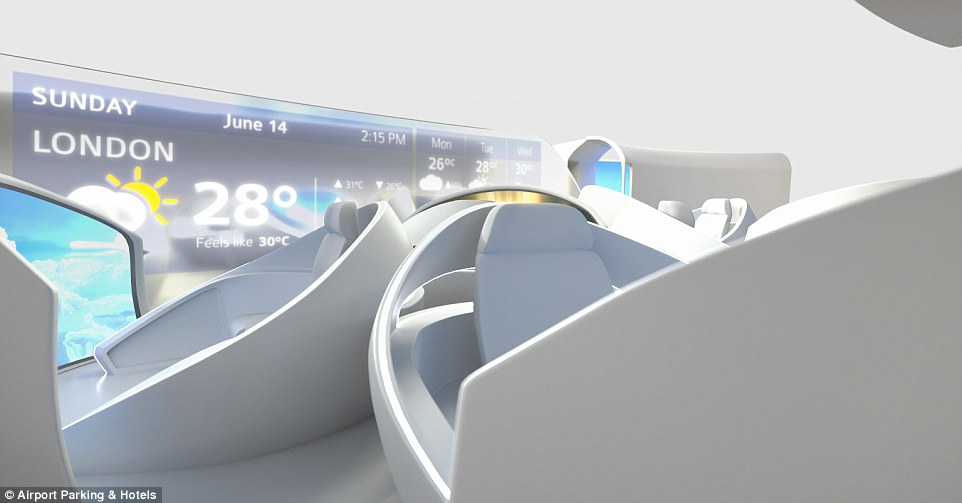 As the plane has very few windows, Transparent LCD screens on the walls show the view outside or films, or any other sort of entertainment stuff.