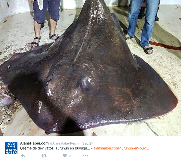 The 450-kilogram common stingray (Dasyatis pastinaca) was caught near Turkey's western Izmir province by Ege University Department of Aquaculture researcher Dr lker Aydin and his graduate students. The team had been conducting a survey of deep-sea fishes in the region, and netted the ray some 100 metres below the surface.