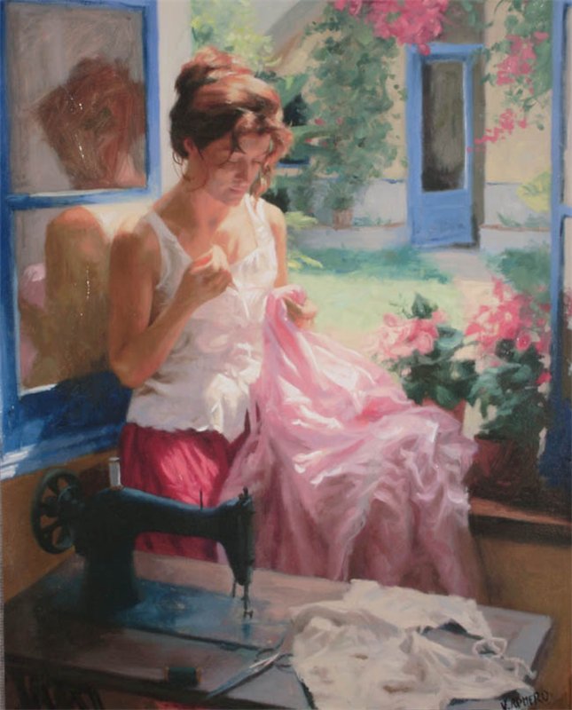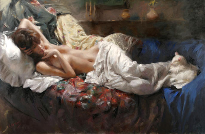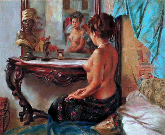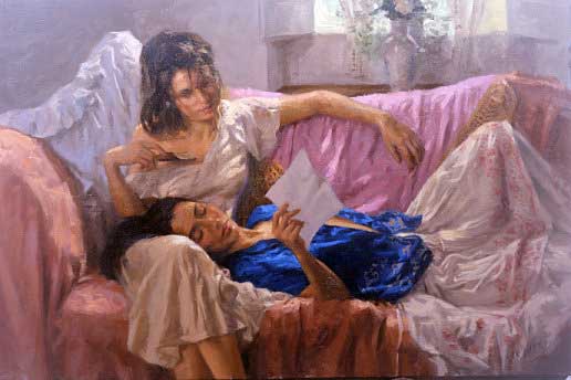 He graduated with special honors in 1982. Then he spent several years working on the street, not the most comfortable but surely the most efficient way to perfect his technique. He painted pastel portraits in coast villages of the mainland and the islands of Tenerife, Majorca and Ibiza. At the close of the eighties, Romero and his wife settled in the Costa Brava. It was in this region (the birthplace of Dali) that a new stage of his artistic life began. The light of the Mediterranean, his skills, his passion, the wonderful landscape, the house with patio where he lived and the beauty of his models--all these were perfect conditions to change his paintings, and finally he succeeded in converting intimate situations of life into the leitmotif of his art. Since the early 90s Romero's paintings have been shown in individual expositions in Spain, France and Portugal. In 2001 he moved to Madrid, but he spends time as well in the Costa Brava with its incredible light, one of the most identifiable aspects of his work.